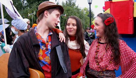 Шествие мимов, акробатов, человека-собаки и огромных кукол по Красному проспекту. Бронзовые статуи, подмигивающие зрителям и оживающие в самый неожиданный момент. Великаны, целующие дамам ручки. Самодеятельные музыканты, выбравшиеся из своих келий и заигравшие на улице. Дети, раскрашенные во все цвета радуги.